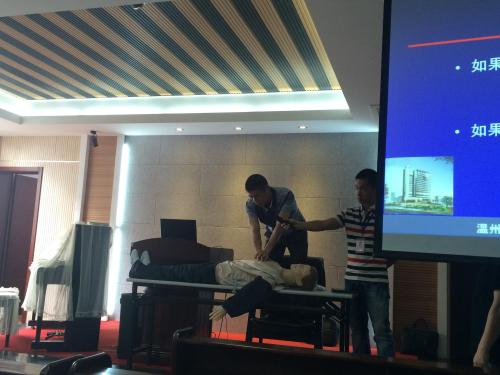 这次大讲堂邀请温州市中心医院急诊科主任医师缪心军作为主讲老师,他利用多媒体演示及多年临床治疗的案例,形象生动地从理论讲解和模拟操作两部分,让大家了解有关心肺复苏术和人口呼吸的相关知识,并通过人体模具精心示范规范施救动作和控制力度,随后,大家纷纷开展起了“模拟急救”演示。