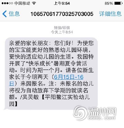 根据网友提供的信息截图显示,平阳县鳌江实验幼儿园办了一个暑期夏令营活动,名为“快乐成长”,为期一个月,要求新生家长在今明两天报名参加,如不报名,“将视为自动放弃下学期的就读名额”。