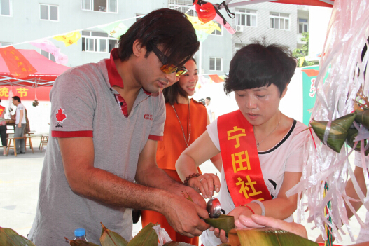龙湾新闻网讯 昨天,海滨街道宁田社区组织社区居民在城东村委会旁的场地上举办“弘扬端午文化,传递浓情粽香”为主题的端午节活动。活动邀请了外国友人、边防战士和幼儿园的小朋友,通过包粽子、制作香囊和编蛋袋、抹雄黄酒活动,让参与者了解中国的端午节,领略中国传统民俗文化的深厚底蕴和魅力。图为社区志愿者教外国友人包粽子。(陈出 摄)
