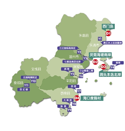 全市范围内已明确规划设置41处游艇基地和停泊点,包括4个大型游艇基地、11个游艇基地和26个游艇停泊点(小型基地)。其中,26个游艇停泊点主要分布在沿海、内河和珊溪库区旅游景点附近。从规划分布图来看,市辖区有10个游艇停泊点,占了全市近四成,只有七都岛近期发展一个综合性游艇基地;瑞安和乐清分别布局了两个大中型游艇基地。苍南和洞头的游艇基地比较多,一共有6个,占了全市三分之一强。