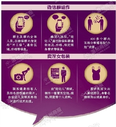 随着利用微信在四五星级酒店让在校生卖淫的“鸡头”朱某的落网,一个遍及香港、澳门、北京、上海、厦门、重庆、哈尔滨、青岛、福州、杭州、宁波、温州等数十个城市的微信卖淫团伙浮出水面。