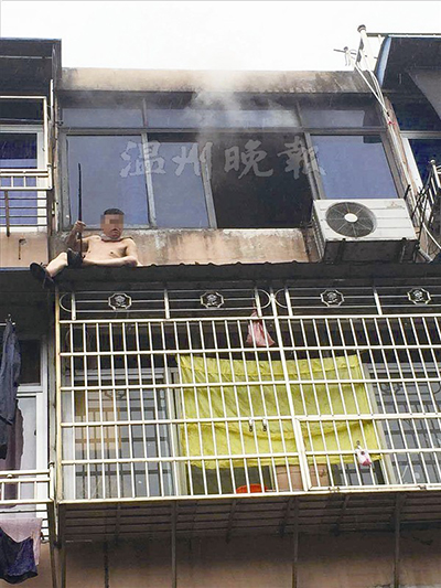 温州网讯昨天8时许,市区翠微新村一处居民楼突发大火,将周围邻居惊出一身冷汗。该居民楼内一名50多岁的男子躲在防盗窗上,消防官兵及时赶到将其救下。现场有群众称,这场火是住户雷某自己放的。