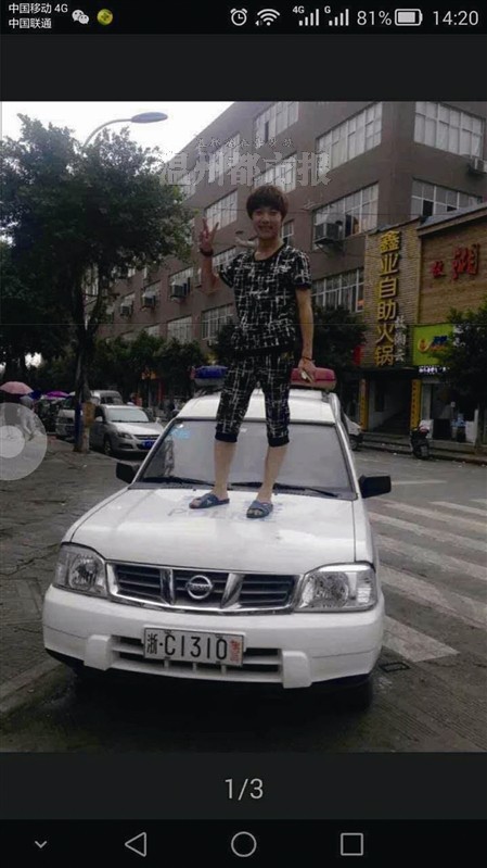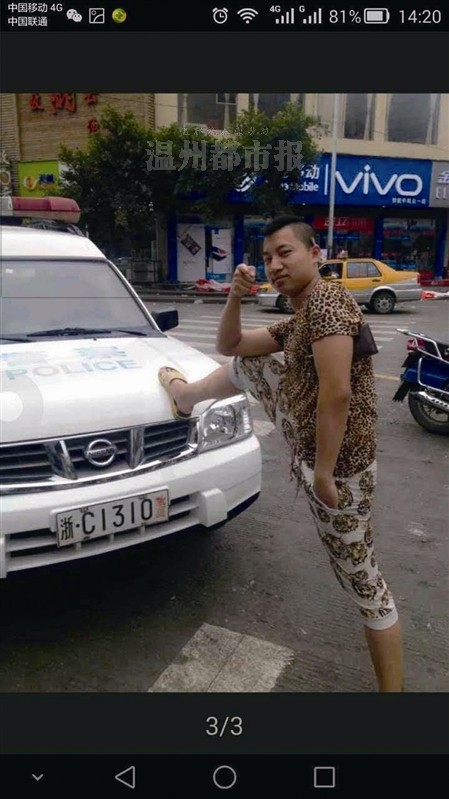当时,马某和徐某在瓯海区娄桥街道上汇村豪新路闲逛,看到停在路边的警车,两人想踩警车拍一张“出格”的照片。于是,马某单脚跨在警车前引擎盖上,徐某站上警车,摆出“V型”手势(如图)。随后,两人将照片上传到社交软件“陌陌”,并配文“无聊,和兄弟踩警车”,迅速引发网友关注。