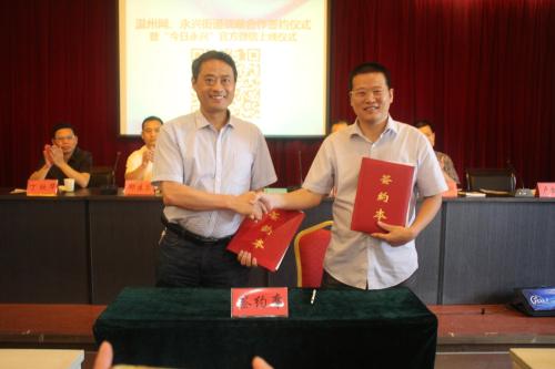 龙湾新闻网讯 6月24日下午,“今日永兴”官方微信平台上线仪式暨永兴街道和温州网战略合作签约仪式在民乐社区举办。温州日报报业集团副社长、温州网总编辑张春校、街道党工委副书记卢金华代表双方签署了合作协议。龙湾区新闻中心副主任丁欣华,街道班子领导、各科室、各村、辖区部门、企业近200人参加到席。