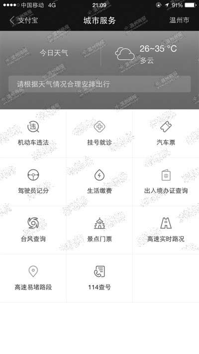 对温州市民来说,用支付宝钱包进行转账、充值、付款等功能其实并不陌生,因此“城市服务”除了纳入原有的水电煤、宽带、天然气等生活缴费功能外,还增加汽车票、景区门票的购买服务;机动车违法查询、医院挂号就诊、驾驶证信息、出入境办证查询、高速实时路况、高速易堵路段、114查号等便民服务;接下来是台风的高发季,“城市服务”还专门有一项“台风查询”。