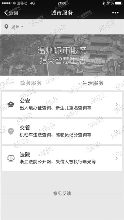 温州网讯仅仅用支付宝来买东西,用微信来聊天的玩法已经过时啦,昨日,浙江政务服务网正式进驻这两个手机APP,在这两大平台上线“城市服务”功能。今后温州市民将可以直接通过微信和支付宝,查询交通违章、天气、路况等实用信息,以及实现预约挂号、交通事故处理、法院诉讼等一系列公共服务。