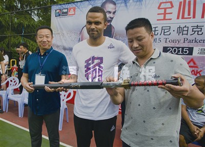 结束在龙湾中学的活动后,帕克一行人马不停蹄地来到温州体育中心,在匹克旗舰店开始签售活动。下午4点左右,帕克来到体育中心室外篮球场,主办方赠送给帕克一把仿汉代的宝剑作纪念。在与参加全国3对3篮球赛温州站揭幕战的两支队伍合影留念后,帕克便起身离开,钻进面包车,直奔机场,他在体育中心室外篮球场的时间不超过20分钟,让久候的球迷大失所望,现场大家用英文呼喊着帕克的名字,帕克很有礼貌地招手示意。