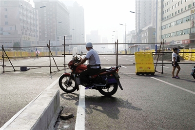 然而,昨天一早,市民陈先生骑着摩托车来到这个路段时,却发现:路口阻止通行的铁栏杆依旧挺立,路面上七零八落,看起来一点都没有通车的意思。