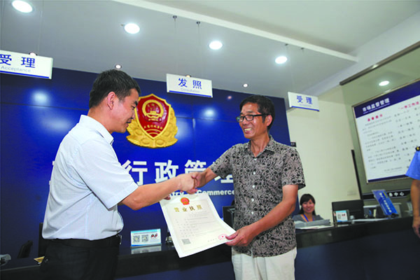 “真没想到,现在办理营业执照这么快速,6月30日下午我把资料递交给工商所便民窗口,第二天早上就接到通知可以领证了。”昨天上午,龙湾居民吴炳新从龙湾区蒲州工商所领取了名为“温州高新技术产业开发区凡客便利店”的个体工商户营业执照。这标志着龙湾区在我市率先完成“两证合一”登记制度改革,该本营业执照也成为我市颁发的首张“两证合一”个体工商户营业执照。