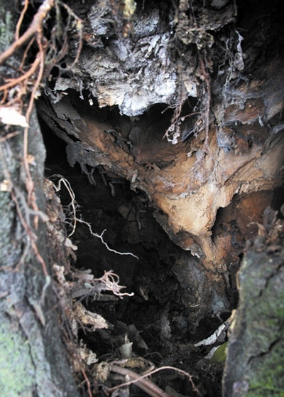 昨天下午2时许,记者找到这棵位于汀田街道寨下村塘路与寨下中心路交界处的大榕树,远看该树目前枝繁叶茂,树的高度约有4层楼高,树冠直径有30多米,树干周长约为8米。但到了树下,树干处一个大洞赫然在目,树干中心多处已发霉腐烂,当时肉眼并没有发现有白蚁等害虫。但该榕树周边堆放有大量垃圾,臭气熏人,蚊蝇较多,还有几根大树枝压在旁边的居民楼上。