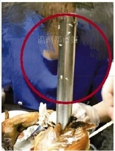 昨天下午,记者在该主题餐厅看到,每张桌上都贴着一张宣传单,写着“本店人气菜品:爱疯6钢管鸡,价格58元”。在该餐厅的厨房内,记者看到了“爱疯6钢管鸡”的餐具,该餐具是不锈钢的,下方是一个托盘,托盘中心连着一根钢管,钢管的顶端是开口的,可以伸进一根食指。