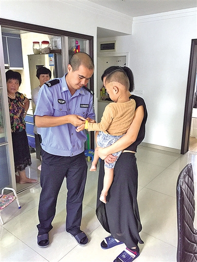 民警倪慧骏给孩子带上爱心黄手环。 胡森博 摄