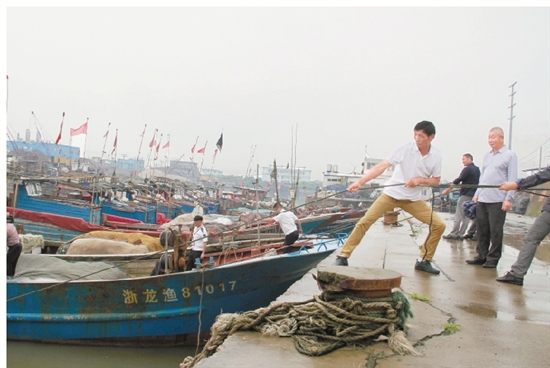 7月8日,在温州龙湾海滨街道蓝田渔港,龙湾区海洋与渔业局加强定人联船负责人巡查,指导渔民安全度汛。叶晓东刘时龙摄