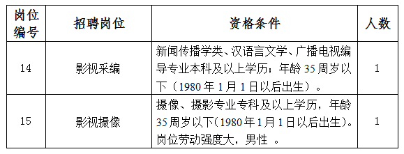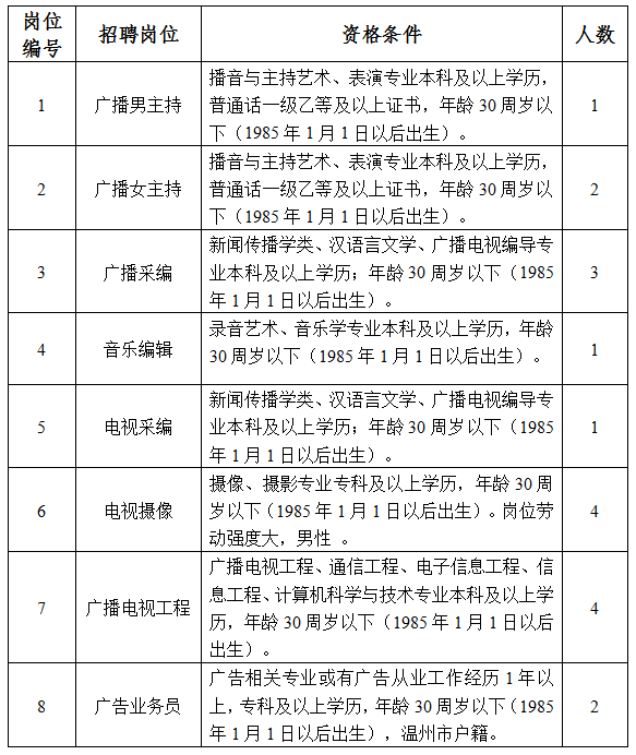 编号1—8岗位为温州广播电视传媒集团部门聘用,编号9-13岗位为温州广播电视传媒集团有限公司所属部门聘用,编号14-15号为温州市电视剧制作中心聘用。