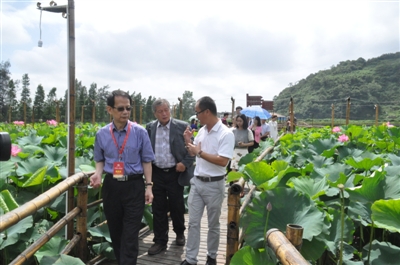 正值夏季,莲情文化园里的莲花开得正旺,近20位台商来到了郑宅村的莲情文化园,观看莲花产业项目,并与龙商一起探讨谋划市场农业发展。在约150亩的大荷塘里,台湾香水莲、王莲、荷花等50多种水生花卉竞相开放。“哇,真的太漂亮了,这里不仅有花有水还有山,这么好的自然风景很难得!”台湾南投县观光协会草屯镇服务站主任萧美瑜不停地用手机记录下这美丽的景色。台商们还参观了山体攀岩、日本锦鲤、蒙古包餐饮等特色拓展项目。