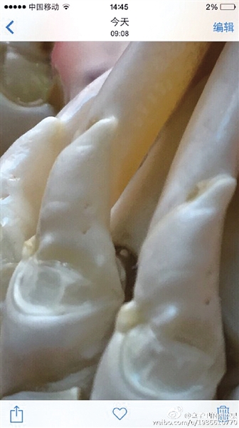 蟹脚上出现疑似针孔。图片来自蔡女士微博