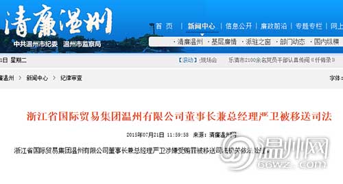 温州网7月21日讯据温州市纪委官方网站“清廉温州”消息:浙江省国际贸易集团温州有限公司董事长兼总经理严卫涉嫌受贿罪被移送司法机关依法处理。