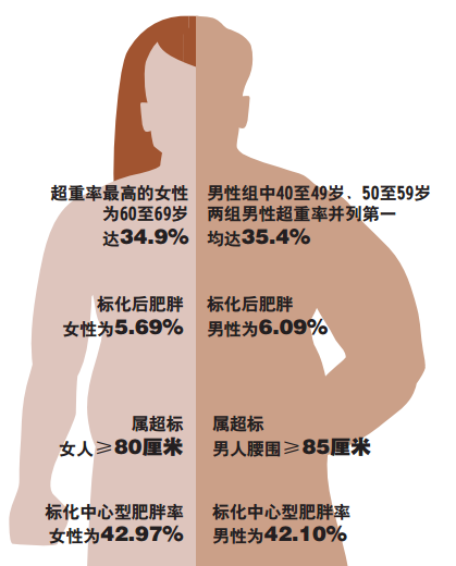 调查显示,标化后肥胖率为5.89%,男性为6.09%,女性为5.69%。肥胖率最高的一组出现在女性里。60至69岁的女性中,肥胖率达9.7%。不仅如此,超重率数据也显示,60至69岁女性的超重率也是女性中最高的,达34.9%。两者一合计,意味着,每100个60余岁的老年女性中,就有10个人肥胖,35个人偏胖(超重)——体重超标的接近5成。