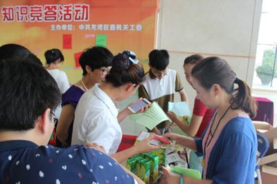 在活动现场,广大机关党员干部纷纷拿出自己的手机,通过“扫一扫”关注“龙湾区直机关工委”微信公众号。在知识竞答活动题库墙上仔细阅读竞答题目,当翻阅到自己知晓的知识题时眉开眼笑,迫不及待地将知识题撕下跟工作人员宣读答案。虽然只是拿到一份小小的礼物,却都能换来参与活动的机关党员干部的开怀一笑……现场气氛非常热烈,短短两个小时,就有超过五百人关注了“龙湾区直机关工委”微信公众号,三百多道知识题全部准确无误地竞答完成。