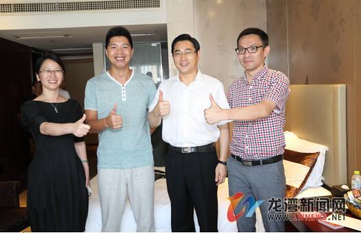 龙湾新闻网7月28日讯( 叶晓东 珠林 摄)7月27日下午,区委书记王军在杭看望慰问了我区首例公务员造血干细胞捐献者王力丰,并为他点赞。据悉,王力丰现供职于区委组织部,是继温州涉外捐赠造血干细胞第一人吴祖琴后龙湾第2例造血干细胞捐献者,是我省首例组工干部捐献者。昨天上午,王力丰在省中医院,第七次注射了动员剂,如果进展顺利,今天上午,他正式进行造血干细胞捐献,跨区域抢救一位47岁的女性血病患者的生命。图左二为王力丰。