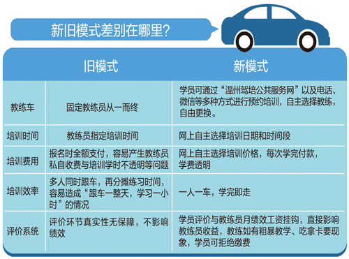“以前都是三四个人一辆车轮换学车,等待的时间较长,一个学员一个上午最多练习两次。现在在‘先学车后付费’新模式下,学员只需要在预约的时间到驾校学习,一辆车一个教练能大大提高学车效率。另外,我们还将学员的评价与教练月绩效工资挂钩,如果有教练获得一个差评,那么该教练在该学员学习时段里,工资要被扣除5元/学时,并可以随时更换教练。”平阳县技工驾校校长孙昌毅说。