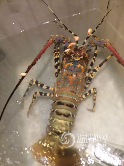 苍南县赤溪镇中墩垂钓爱好者张宏剑在福建秦屿镇钓到的中华锦绣龙虾