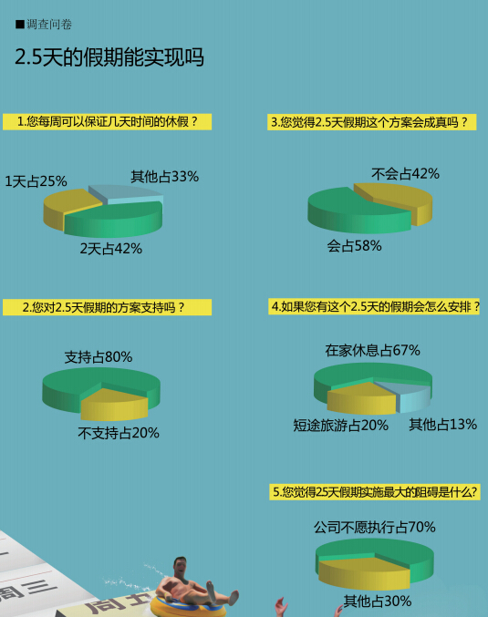 然而,涉及“您认为每周2.5日假期的方案会成真吗”这一选项中,35名市民选择了“不会”,占了近六成。他们大多数认为,2.5日假期很难实现的原因是因为企业不愿意实施,同时也无条件实施。在一家国有银行工作的小谢告诉记者,自己连年假都不敢休,更不指望这还未定数的2.5天。“领导都没休假呢,我们怎么好意思休?万一给领导留下不勤奋工作的印象,以后调动、升迁都麻烦。”在不少企事业单位中,按规定休假会被视为“偷懒”、“事业心不强”,很多人想休假却不敢休。