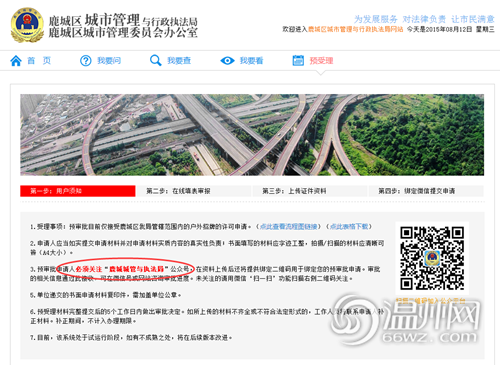 鹿城区城市管理与行政执法局信息科杨介聪回应,申请人关注“鹿城城管与执法局”公众号可以进一步收到一对一的申请反馈信息,形成良好的互动关系,如果不关注,将无法进入下一步申请。杨介聪表示,官方网站仍在进一步完善中,将于下个月实现对外开放。