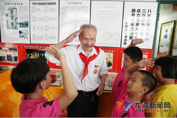 龙湾新闻网讯 8月15日,民革龙湾总支组织30多名志愿者,开展“铸爱国之魂、弘爱国之情——纪念中国人民抗日战争胜利70周年”系列主题教育活动。在宁村抗战展览馆,抗战老兵潘庭槐、项延年和方彩耀向小志愿者讲述抗战故事,并与志愿者一起分享抗战胜利的丰功伟绩。来自温州蒲鞋市小学龟湖校区的11位学生分别采访了三位抗战老兵。龙湾民革向三位老兵赠送了体检卡,祝福老人们健康长寿。此前,龙湾民革还发起募捐,为宁村抗战展览馆捐赠了空调和讲解扩音器。图为少先队员向潘庭槐致敬。(叶晓东 姜珂珂 摄)