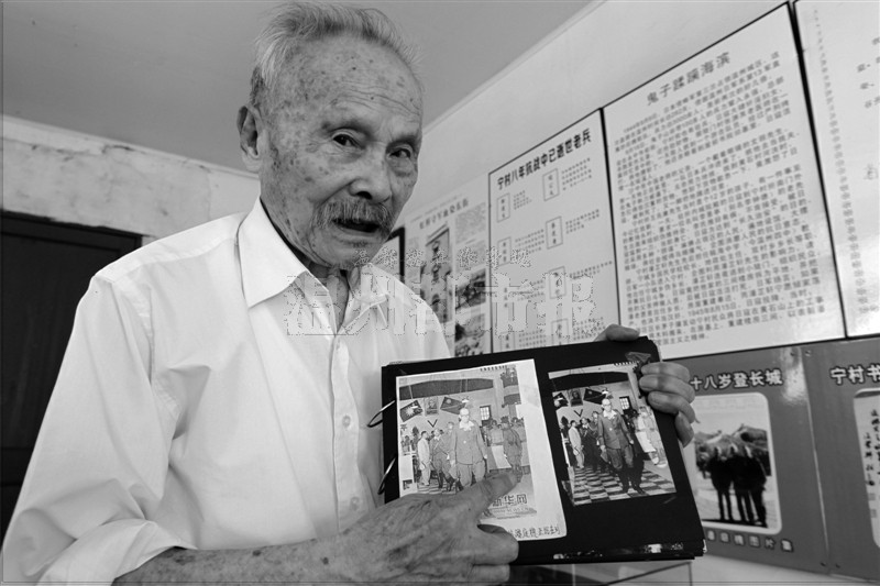 龙湾海滨街道宁村宗祠二楼一个房间内,墙上挂有“日军签署投降书”等重大抗战历史节点的照片资料;“虹桥守军血染东街”、“抗战老兵讲述莲花心血战”等抗战故事媒体报道……这些都是潘庭槐老人用子女给的零花钱搜集、制作的。