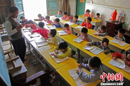 资料图:湖南道县蚣坝镇下福洞村村小一名乡村教师,21名小学一年级学生,组成了一所“袖珍”客厅学校。何红福摄