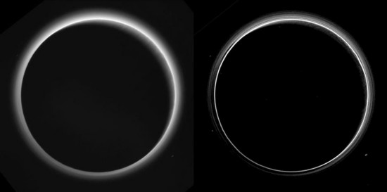 新视野飞越冥王星后,朝后方拍摄的冥王星背部图像。左边图像是太阳-冥王星-新视野号一条直线时完全背光的图像,新视野号只用了较少的处理程序得出了冥王星大气层的轮廓;但当对数据进行更细致的处理,得出的右侧图像则显示冥王星大气层内还有一些令人疑惑的分层现象。(图片来源:NASA官网)