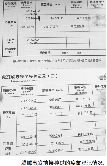 据该中心一名负责人介绍,当天上午,除了腾腾,另外还有几名孩子也接种了该疫苗,都没有发生类似的情况,而腾腾打完针短时间内就出现了抽搐症状,随后护士马上叫来了临床医生诊断,医生观察后随即让人送孩子去医院救治。