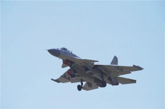 图为歼-15舰载战斗机进行训练。该机由中国航空工业集团公司沈阳飞机工业集团研制。2012年11月23日歼-15成功降落在辽宁号航空母舰甲板上。CFP