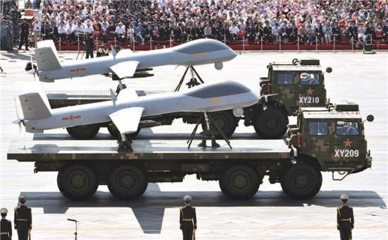 图为无人机方队接受检阅。中国航空工业集团公司是中国最大的无人机制造商,也是此次参加阅兵仪式的三大无人机之一的GJ-1的制造商。CFP