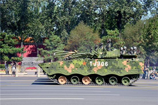 99A型坦克方队。该坦克由中国兵器工业集团公司研制生产,号称“陆战之王”,这是该坦克第一次在国内登场。CFP