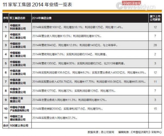 《中国经济周刊》记者根据公开资料整理,截至2014年底,11大军工集团下辖共计100家上市公司,其中A股上市公司82家,H股上市公司16家(编者注:有1家公司同时在A股和H股上市),境外上市公司3家。中国兵器装备集团公司、中国兵器工业集团公司、中国航空工业集团公司等巨头2014年营业收入均在4000亿元左右。军工“王牌军”产业规模之大、技术之先进、制造能力之强,已经成为支撑我国军事装备的中流砥柱。