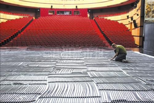 3、在隔水膜上铺上冷凝管。这是整个步骤中最重要的环节,300多条冷凝管布满整个舞台,并与停在剧院后门的集装箱用两根管道相连接,制冰开始时,位于集装箱内的压缩机开始工作,为冷凝管来回输送氟利昂,保持冰面温度在零下20℃;