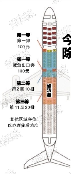 “一般情况下,飞机经济舱的座位分为四等,最好的是经济舱座位第一排和紧急出口,因为座椅间距比较大;第二等是经济舱第2至10排,飞机颠簸晃动时受影响较小;第三等是经济舱第11至20排。除以上区域外,旅客指定其他区域座位的各家航空公司都不收费。”据国航温州分公司相关工作人员介绍,国航目前已将飞机座位明码标价。经济舱第一排和紧急出口处位置,国际航线预订费600元,亚洲航线预订费100至300元,国内航线为100元,除以上区域外,旅客仍可不加费预订其他区域的座位。9月9日—11月9日期间为国航的“选座日期”,旅客可以通过国航无线平台付费选位。“目前这一政策仅适用于北京出港的国内航班。”国航温州分公司相关工作人员表示,中秋期间由北京乘坐国航回温的旅客还可在乘坐后获得99元代金券一张。