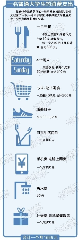 “不仅仅是聚餐,我们还喜欢周末去市区泡吧唱歌,而酒吧KTV这类场所消费本来就不低。如果玩得时间晚了还要在市区住宿,这样又要多花100-200元不等。你也可以都不参与集体活动,那样最省了,一个月七八百块就可以了。”90后大学生小冷告诉记者,对他来说,人际交往很重要,如果都没有人叫你出去吃饭或者唱歌还会觉得很没面子的。