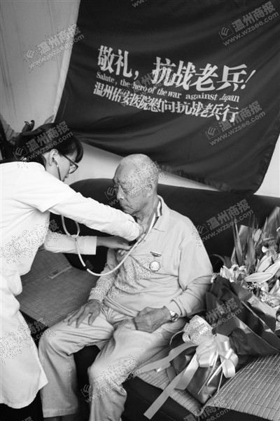 为纪念抗日战争和世界反法西斯战争胜利70周年,近日,温州佑安医院体检中心开展了主题为“关爱抗战老兵”的中秋慰问活动。龙湾区6名年龄均超过90岁的抗战老兵接受了医护人员的基本健康检查以及该中心领导、工作人员的亲切慰问。