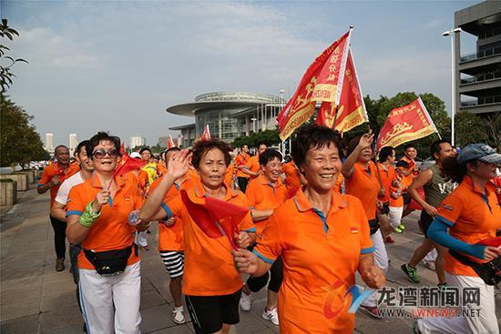 记者在现场看到,上午7点不到,不少市民已早早来到出发地点——世纪广场。50名志愿者在6点30分提前来到各活动现场。7点30分,来自温州各县市区的体育健儿们按20多个方队排成3列,在辅道整齐跑步前行。经过车站大道、市府路5公里的跑步运动,回到起点。队伍中既有青壮年,也有花甲老人。不少跑步健儿们的衣服上印着五星红旗,手拿小五星红旗,形成一道靓丽的风景线,引来不少市民驻足观看。