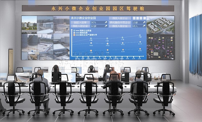 永兴南园率先试点“1+4+4”智慧园区建设模式,实现运营管理、智慧制造、云服务和信息资源继承等“一站式”服务:轻点鼠标,可以查看园区内任何一栋楼内的任何一台机械运作情况;打开手机,可以实时监控园区动态,并提出要求和建议。负责运营服务的工作人员介绍,这些功能可以让企业主能够利用碎片化的时间,提高工作效率,节约投资成本。