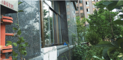 在2栋一楼,有住户把阳台往外多修了半米,还用玻璃墙体包裹起来,而这块区域原本是片绿化带。记者还看到,有顶楼住户将通风口改装成阳台,并装上水龙头,也有住户把家中大门往外“挪”了半米……
