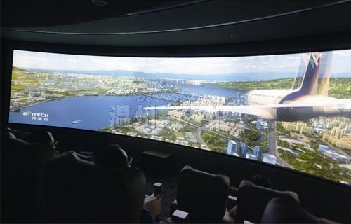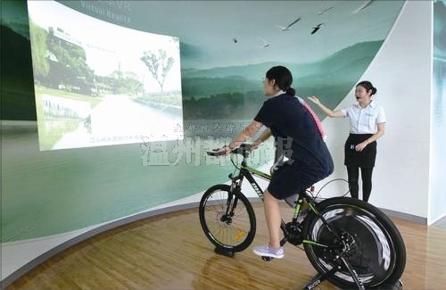 在靓丽山水厅内,参观者能边学边玩,骑着自行车游江心屿,眼前是江心屿的实景投影,脚下是真实的自行车,骑速的快慢直接连接画面的行进速度。除了江心屿,参观者还能开着游艇看南塘夜景,穿梭在南塘水中,若稍有不慎撞到了桥墩还能感受到游艇的震动,透过模拟的船舱能够看到动态的“窗外风景”。