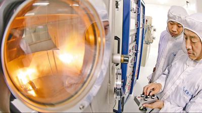 图为10月14日,秦皇岛星箭特种玻璃有限公司的工人在对空间玻璃进行镀膜。