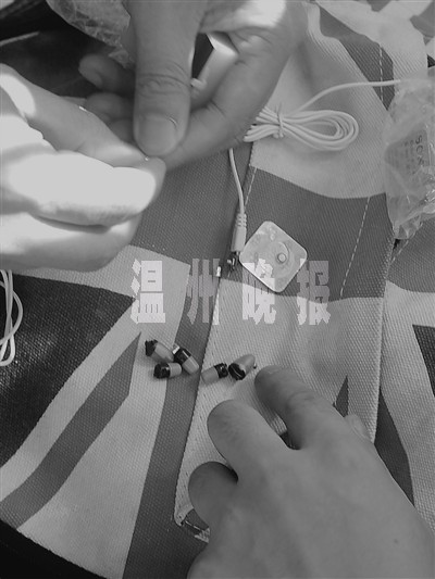 记者看到,整套作弊设备包括一个黑色火柴盒大小的接收器、几根连接线、若干微型耳机、几个电池等,做工粗糙。对方称,使用时,要将接收器与两根连接线连接,一头为微型接收器开关,另一头末端为接收信号的接收器。同时,设备配有两款微型耳机,一款为紫色半椭圆状,直径不足1厘米,在尾部连接着几毫米长的铁丝线,使用时只需将紫色一头塞入耳中,另一款是比米粒还小的金属制体,使用时要放入耳中,使用后需靠磁铁从耳中吸出。