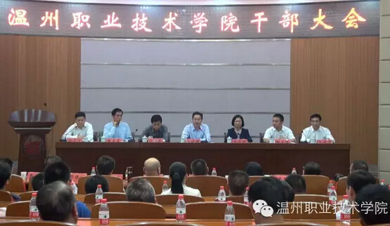 10月22日下午2点,在温州职业技术学院正德楼罗山厅召开温州职业技术学院干部大会。出席本次会议的有省委教育工委副书记、省教育厅副厅长汪晓村,省教育工委委员、干部处处长应方彩,省委组织部干部三处副处长、调研员叶志航,市委组织部副部长胡永锋,温州职业技术学院党委书记陈光天,温州职业技术学院新任党委书记王靖高,会议由学院院长谢志远主持。