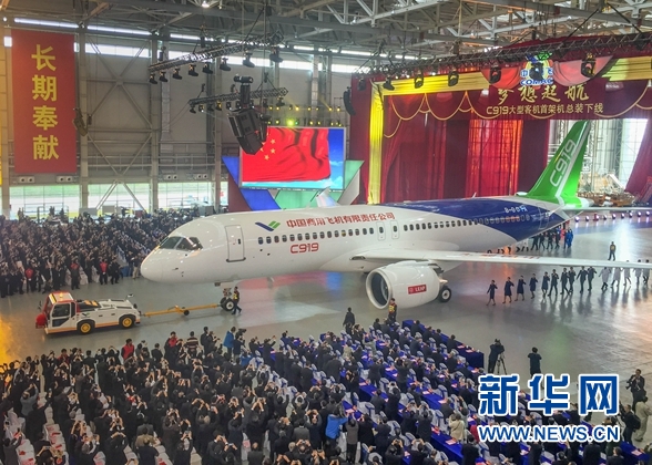 11月2日,我国自主研制的C919大型客机首架机,在中国商飞公司新建成的总装制造中心浦东基地厂房内正式下线。新华社记者裴鑫摄