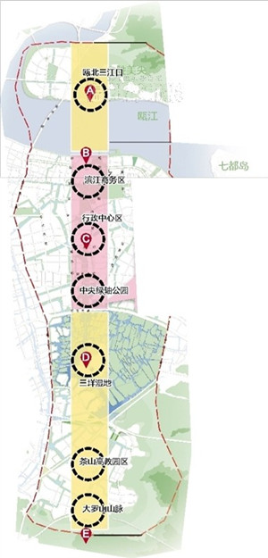 城市中轴范围几乎涵盖了温州城市主要的几个功能要素。从北到南来看,分别是瓯北三江口、滨江商务区、行政中心区、中央绿轴公园、三垟湿地、茶山高教园区、大罗山山脉。